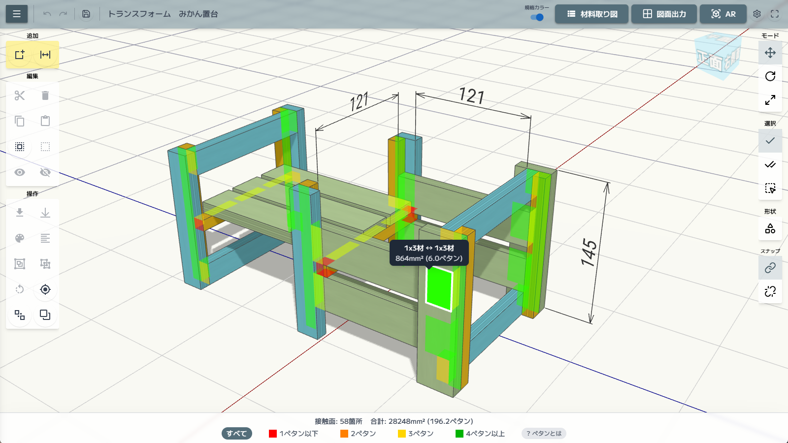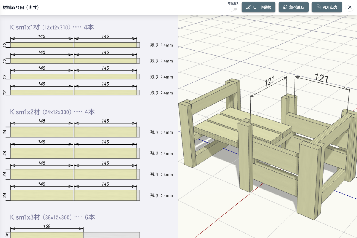 設計した作品の材料取り図をワンタッチで自動生成。材料から各パーツをどのように切り出すかを視覚的に確認でき、効率的な加工計画を立てることができます。