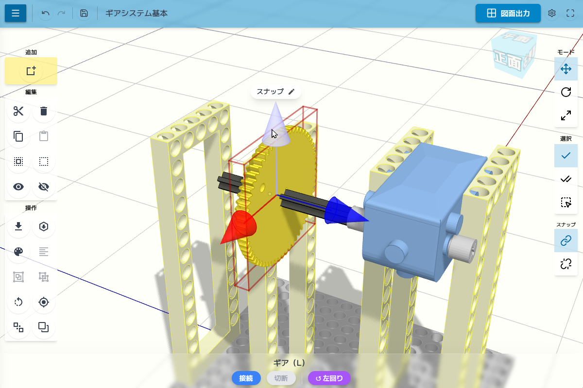 モーターやギアなどの動力パーツを配置し、伝達経路を視覚的に設定できます。速度,トルク(動力)の変化をシミュレーションで確認しながら、動く仕組みを直感的に学ぶことができます。